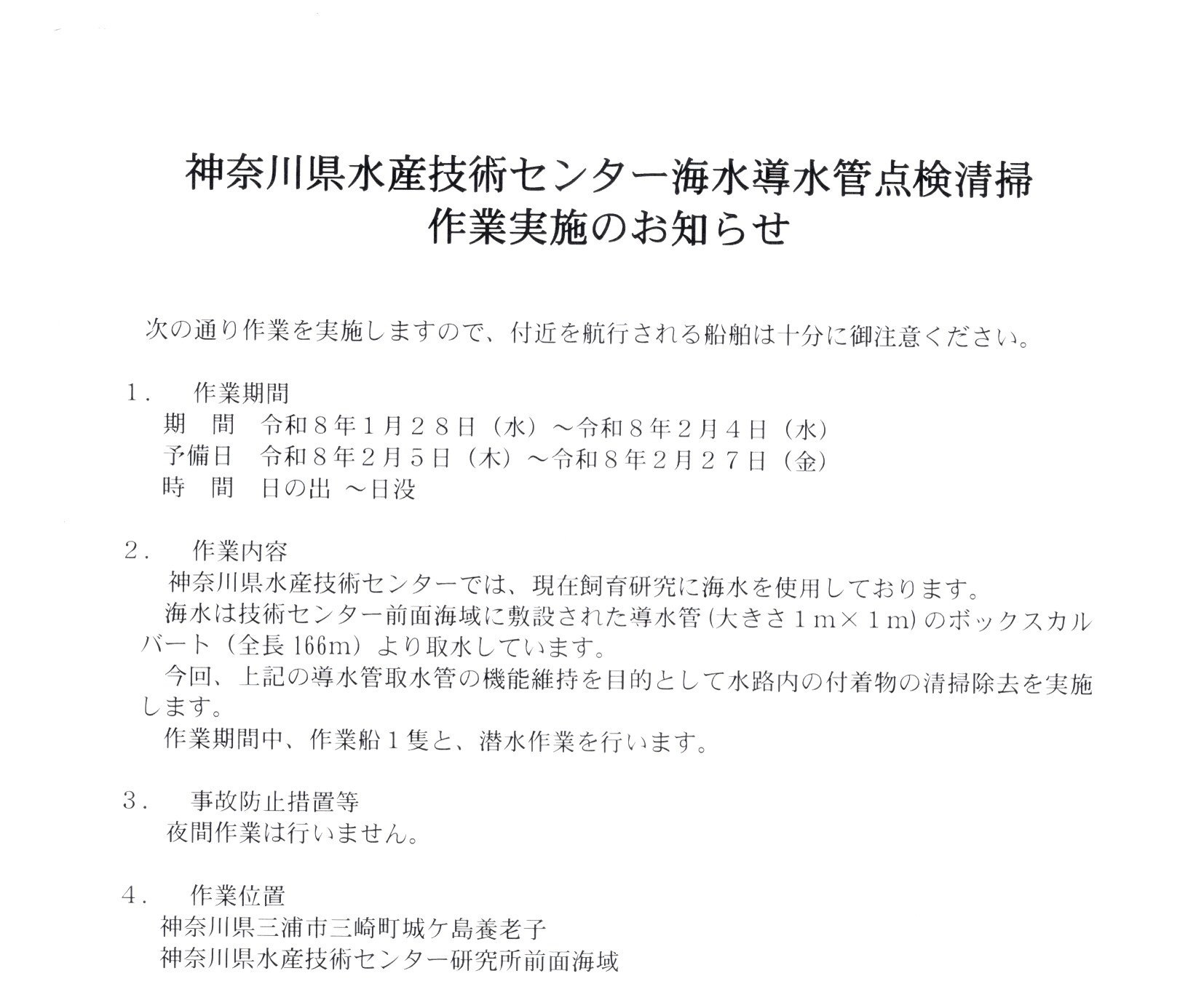 1月28~2月27日、城ヶ島付近航行の際はご注意ください。
